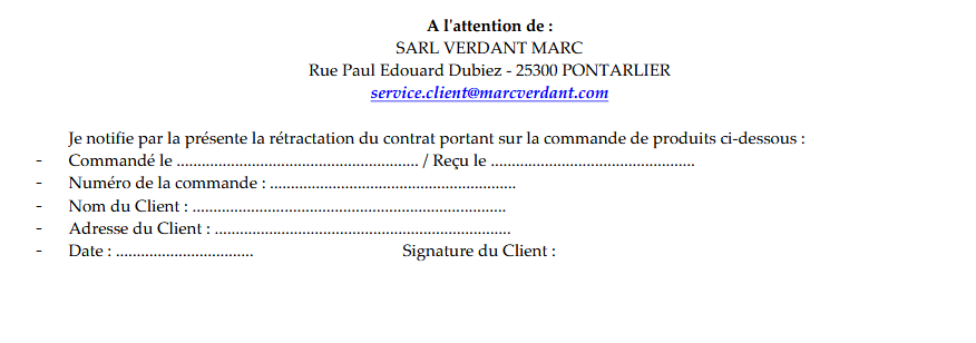 Le présent formulaire doit être complété et renvoyé uniquement si le Client souhaite se rétracter de la commande passée sur le Site internet du Vendeur sauf exclusions ou limites à l’exercice du droit de rétractation suivant les Conditions Générales de Vente applicables.